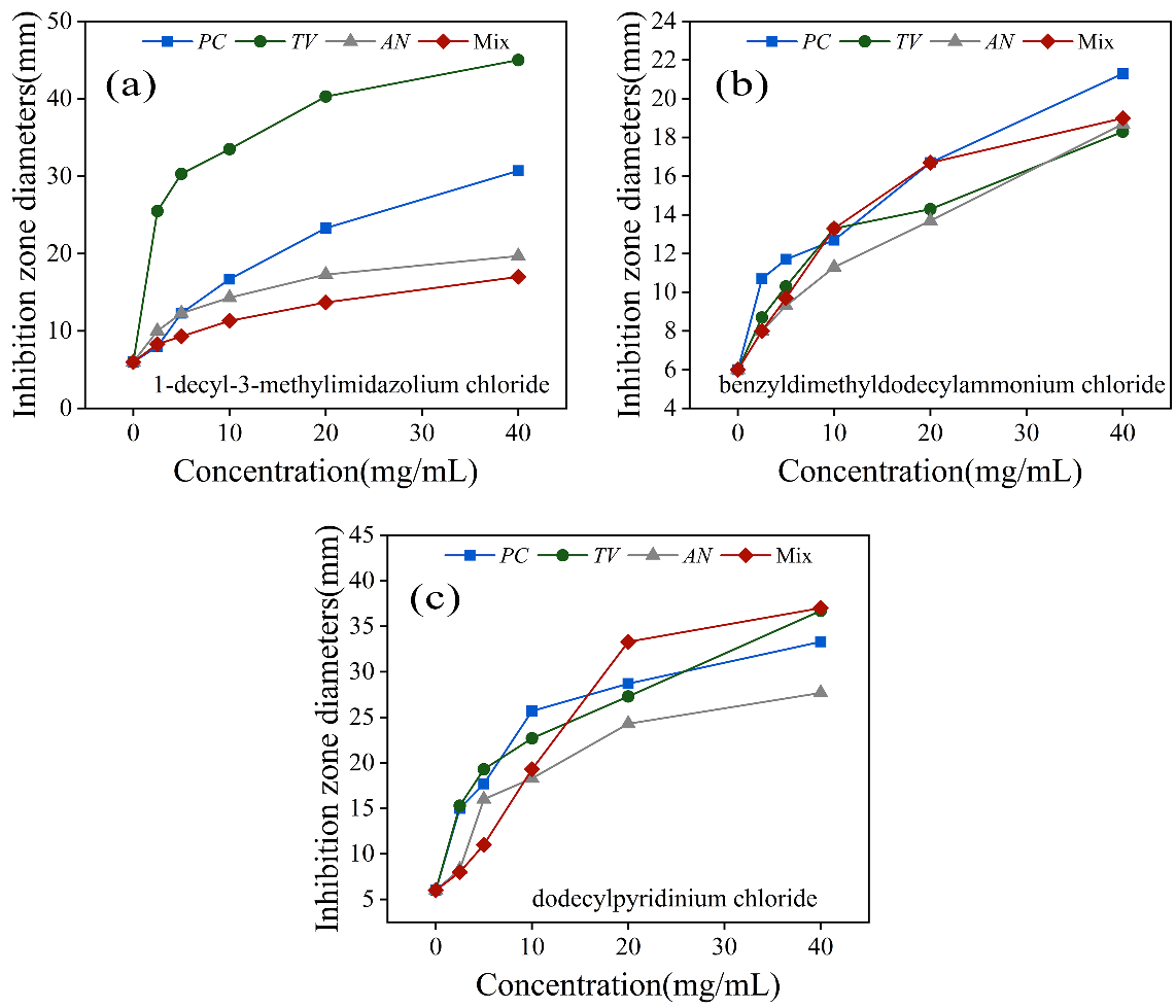离子液体是一类完全由阳离子和阴离子组成的有机熔盐,具有极低蒸气压、低粘度、低毒性、高热稳定性和强抗真菌潜力的特点。本论文研究了离子液体阳离子对柑桔青霉(PC)、绿色木霉(TV)和黑曲霉(AN)的抑制性能,以及细胞膜破坏的机制。采用牛津杯法、SEM和TEM研究了离子液体对菌丝体和细胞结构的损伤程度和具体作用位点。结果表明:1-癸基-3-甲基氯化咪唑对TV有较强的抑制作用;苄基二甲基十二烷基氯化铵对、及混合培养物有较弱的抑制作用;十二烷基氯化吡啶对、和Mix均表现出显着的抑制作用,其中对AN和Mix的抑制作用更为显着,MIC值分别为5.37 mg/mL、5.05 mg/mL、5.10 mg/mL和5.23 mg/mL。霉病菌丝体出现干瘪、局部缺失、扭曲、粗细不均;细胞结显示出质壁分离等现象。PC和TV的细胞外液吸光度在30 min后达到最大值,而AN的细胞外液吸光度在60 min后达到最大值。这些发现为离子液体抗真菌剂在竹子、医药和食品中的应用提供了重要启示。
